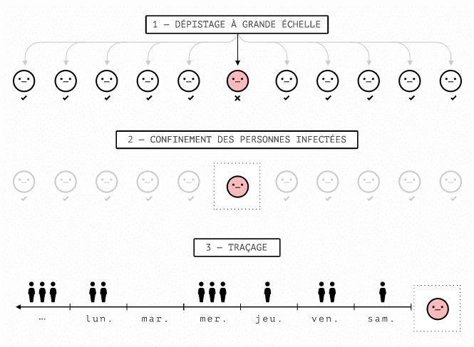 C’est pour cela que de nombreux pays envisagent une stratégie plus fine, sur le modèle sud-coréen, qui repose sur trois piliers : dépistage massif, isolement des personnes infectées et suivi de leurs contacts.