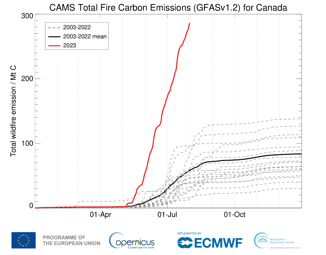 On y référait à un article du Service de surveillance de l’atmosphère de Copernicus, où on y trouve, entre autres, le graphique ci-contre qui, comme son nom l’indique, montre les émissions totales de carbone dues aux incendies (Total Fire Carbon Emissions) pour le Canada depuis le début de l’année.