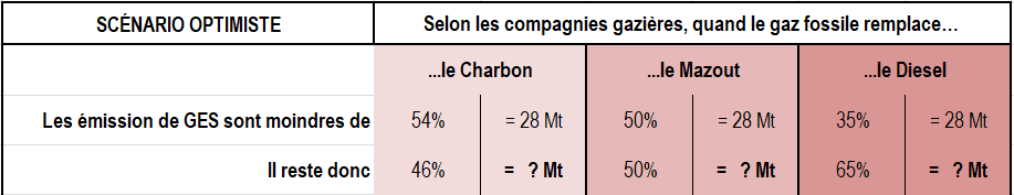 Ainsi, nous découvrons que si le gaz fossile émettra 28 Mt de GES de moins que les autres fossiles, comme le dit GNL, il en émettra quand même une bonne quantité, soit, selon le fossile qu’il remplacera : 23,9 Mt dans le cas du charbon, 28 Mt dans le cas du mazout et 52 Mt dans le cas du diésel.