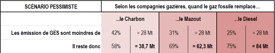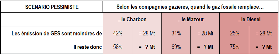 Dans ce scénario pessimiste (ou moins optimiste), si le gaz fossile est utilisé à la consommation en remplacement des trois autres fossiles identifiés, on observera une diminution d’émissions de GES, selon le fossile, à la hauteur de :